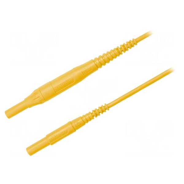 Parametry techniczne obejmują maksymalną rezystancję styku na poziomie 25 mΩ oraz zakres temperatury pracy od -10°C do 70°C. Przewód jest przystosowany do pracy w instalacjach spełniających wymogi normy EN 61010 w kategorii bezpieczeństwa CAT IV 1000V. Element ten występuje w kolorze żółtym.