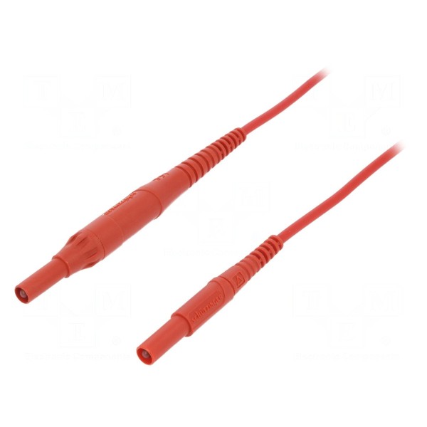 Produkt charakteryzuje się prądem znamionowym 8 A i spełnia wymogi bezpieczeństwa określone w normie EN 61010 dla kategorii CAT IV 1000 V. Kabel w kolorze czerwonym jest przeznaczony do zastosowań w układach pomiarowych wymagających standardowych złączy bananowych.
