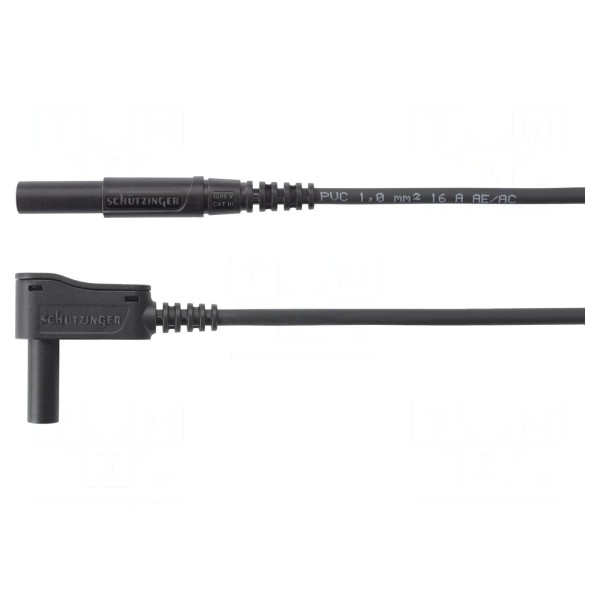 Przewód pomiarowy o długości 1 m wyposażony w osłonięty wtyk bananowy 4 mm oraz wtyk bananowy kątowy 4 mm. Przewód o przekroju 1 mm² posiada izolację wykonaną z PVC oraz niklowane styki, których maksymalna rezystancja wynosi 17 mΩ.