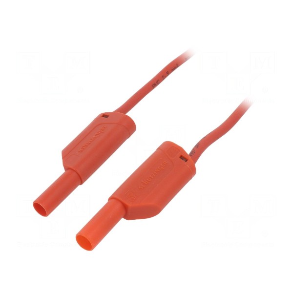 Przewód pomiarowy o długości 1 metra został zakończony z obu stron izolowanymi wtykami bananowymi o średnicy 4 mm. Wyposażony jest w gniazdo osiowe 4 mm, co umożliwia wygodne łączenie szeregowe. Przewód w kolorze czerwonym posiada przekrój 2,5 mm² i wykonany jest z izolacji typu PVC.