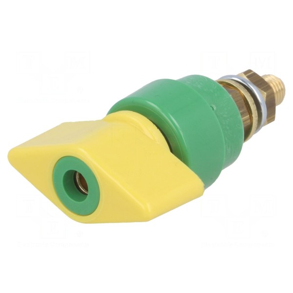 Komponent wykonano z mosiądzu w części stykowej, natomiast izolację stanowi poliwęglan w kolorze żółto-zielonym. Montaż odbywa się za pomocą połączenia śrubowego bezpośrednio na panelu. Całkowita długość elementu wynosi 58 mm, a materiał styku został dodatkowo pokryty mosiądzem.