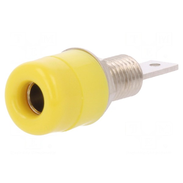 Złącze laboratoryjne typu bananowego o średnicy 4mm zostało zaprojektowane do montażu na panelu. Element występuje w wersji izolowanej w kolorze żółtym i charakteryzuje się niklowanym pokryciem styku.