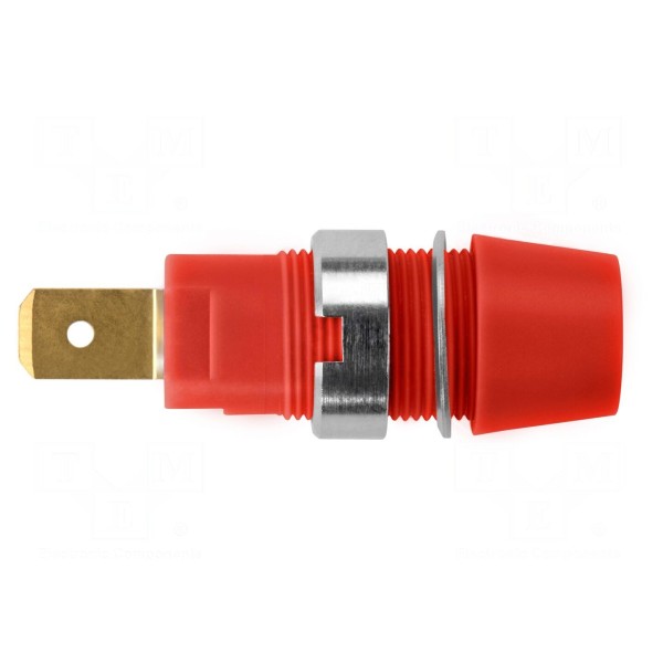 Złącze w kolorze czerwonym posiada całkowitą długość 41 mm. Jest to element typu gniazdo, zaprojektowany do pewnego połączenia w układach pomiarowych i zasilających.