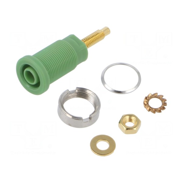 Złącze laboratoryjne typu gniazdo bananowe 4mm zaprojektowane do montażu na panel. Element charakteryzuje się napięciem znamionowym 1kV oraz prądem znamionowym 32A. Konstrukcja złącza posiada złocone pokrycie styku oraz izolację wykonaną z poliamidu.