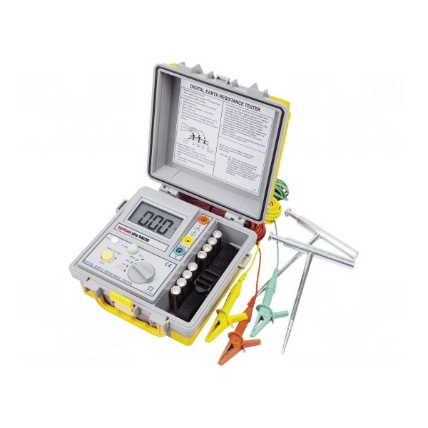 Do poprawnej pracy miernik wymaga zasilania z ośmiu baterii LR6 AA 1,5V. W zestawie: krokodylki, pręty pomiarowe, przewody pomiarowe.