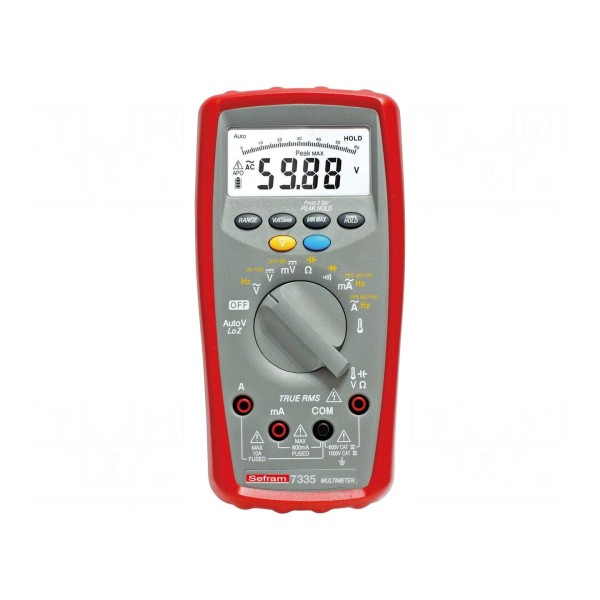 Multimetr cyfrowy SEFRAM 7335 to przyrząd pomiarowy wyposażony w wyświetlacz LCD o rozdzielczości 3,75 cyfry (6000 zliczeń) oraz bargraf. Urządzenie umożliwia pomiar napięcia DC do 600V i AC do 1kV, a także prądu stałego i zmiennego w zakresach do 10A. Przyrząd obsługuje pomiar True RMS AC+DC, zapewniając precyzyjne odczyty w szerokim spektrum zastosowań. Dodatkowo miernik oferuje funkcje pomiaru rezystancji (do 40MΩ), pojemności (do 10mF), częstotliwości (do 100kHz) oraz temperatury w zakresie od -40 do 400°C przy użyciu zewnętrznej sondy.