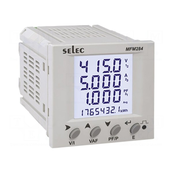Cyfrowy miernik parametrów sieci SELEC MFM284-C-CE jest przeznaczony do montażu panelowego w sieciach 3-fazowych, 3-przewodowych oraz 4-przewodowych. Urządzenie realizuje pomiar napięcia AC, prądu AC, mocy czynnej, biernej i pozornej, energii oraz wartości THD. Pomiar prądu odbywa się w sposób pośredni z wykorzystaniem przekładnika prądowego 5A, przy maksymalnym prądzie 6A oraz obsłudze zakresów od 1kA do 10kA.