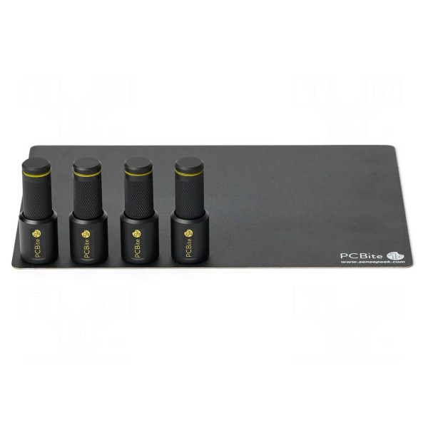 Zestaw zawiera cztery uchwyty PCBite o wysokości 50mm, małą płytkę bazową formatu A5 oraz matę izolacyjną. W skład pakietu wchodzi również komplet podkładek izolujących oraz ścierka z mikrofibry do konserwacji narzędzi.