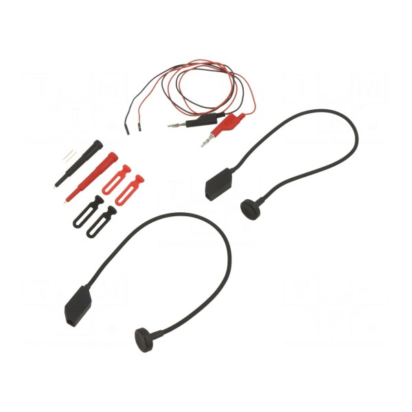 W zestawie: igła testowa x2, przewód pomiarowy x2, sonda pomiarowa x2, uchwyt do kabli x4. Zestaw umożliwia konfigurację połączeń pomiarowych w układach elektronicznych.