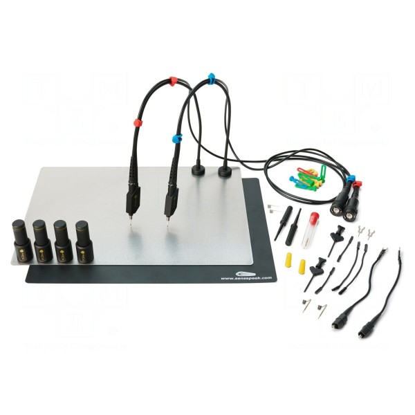 W zestawie: duża płytka bazowa (A4), komplet podkładek izolujących, mata izolacyjna, ścierka z mikrofibry, sonda pomiarowa x2, uchwyt PCBite x4.