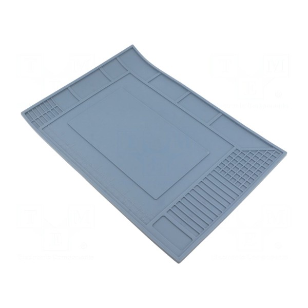 Produkt charakteryzuje się wymiarami 297x210mm oraz właściwościami antypoślizgowymi, które ograniczają przemieszczanie się narzędzi i komponentów na stanowisku. Mata wykazuje wytrzymałość temperaturową do 480°C, co pozwala na bezpieczne lutowanie bezpośrednio na jej powierzchni.