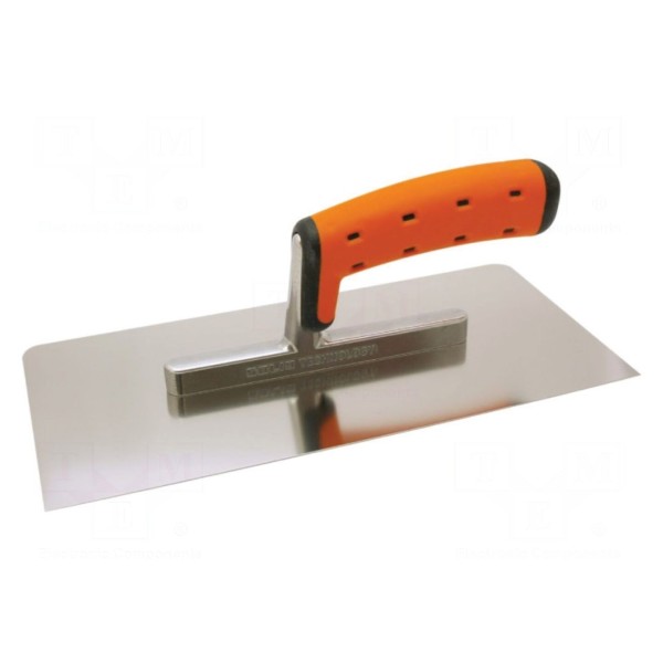 Paca wykończeniowa została wykonana ze stali nierdzewnej, co zapewnia odpowiednią odporność materiału podczas prac tynkarskich. Konstrukcja narzędzia wyróżnia się zaokrąglonymi rogami, które ograniczają ryzyko pozostawiania śladów na obrabianej powierzchni.