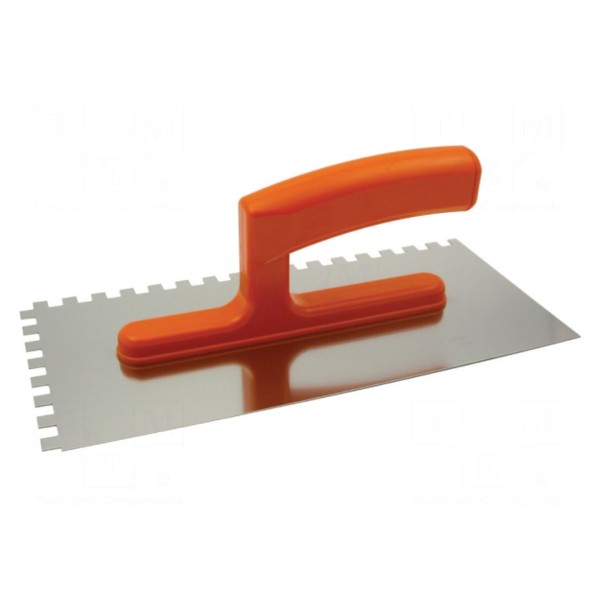 Paca zębata o wymiarach 270mm długości oraz 130mm szerokości przeznaczona jest do prac wykończeniowych. Konstrukcja narzędzia opiera się na zastosowaniu stali nierdzewnej, co wpływa na jego odporność na korozję podczas kontaktu z zaprawami i masami budowlanymi.