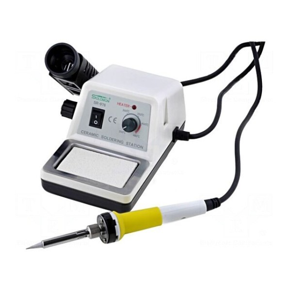 Stacja lutownicza SR 976 o mocy 50W przeznaczona jest do prac wymagających precyzyjnej kontroli temperatury w zakresie od 250 do 480°C. Urządzenie wyposażono w ceramiczną grzałkę oraz analogowy system regulacji temperatury obsługiwany za pomocą pokrętła. Sprzęt posiada funkcję optycznej sygnalizacji informującej o osiągnięciu zadanego poziomu temperatury.