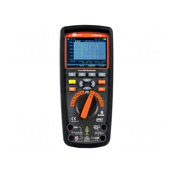 Konstrukcja przyrządu o klasie szczelności IP67 zapewnia odporność w trudnych warunkach pracy, co potwierdza zgodność z normami CAT III 1000V oraz CAT IV 600V (EN 61010). Multimetr oferuje automatyczną i ręczną zmianę zakresów, funkcje HOLD, MIN/MAX oraz rejestrację danych z datą i czasem do 2000 pomiarów. Komunikacja z urządzeniami zewnętrznymi odbywa się poprzez interfejs Bluetooth, a wbudowana latarka ułatwia pracę w miejscach o ograniczonym oświetleniu.