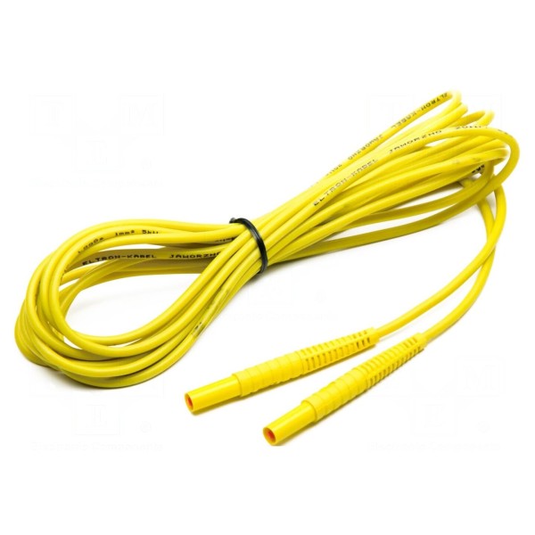 Przewód pomiarowy o długości 5 metrów został wyposażony w izolowane wtyki bananowe o średnicy 4 mm umieszczone po obu stronach. Konstrukcja zapewnia dopasowanie do standardowych gniazd pomiarowych oraz bezpieczeństwo użytkowania podczas wykonywania prac kontrolno-pomiarowych.