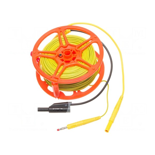 Przewód pomiarowy o długości 50 metrów został zaprojektowany do prac pomiarowych wymagających ekranowania sygnału. Konstrukcja przewodu obejmuje wtyk bananowy 4mm oraz dwa wtyki bananowe z gniazdem osiowym 4mm. Produkt charakteryzuje się żółtym kolorem izolacji, co ułatwia jego identyfikację podczas rozwijania na obiekcie.