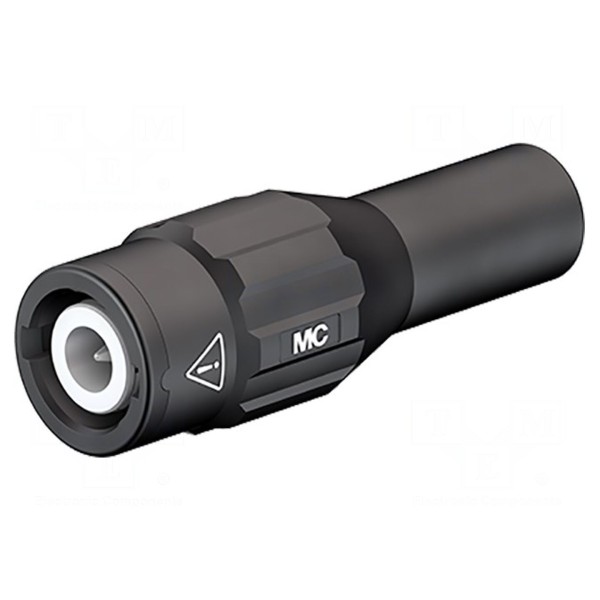 Adapter BNC typu męskiego jest przeznaczony do połączeń w układach pomiarowych. Element charakteryzuje się czarną obudową oraz konstrukcją przystosowaną do montażu wciskanego.