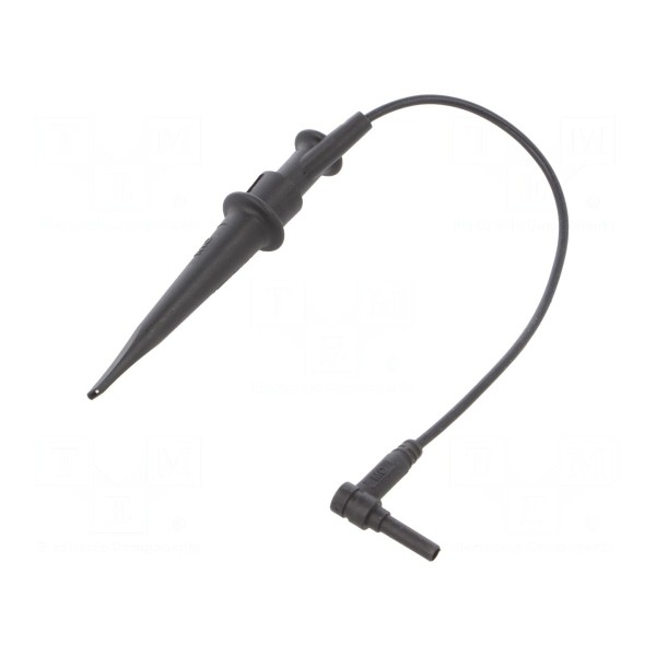 Chwytak pomiarowy typu haczykowego w kolorze czarnym przeznaczony jest do wykonywania połączeń w układach pomiarowych. Element charakteryzuje się napięciem znamionowym 1kV DC oraz obsługuje zakres chwytania przewodów lub komponentów o średnicy do 4,3mm.