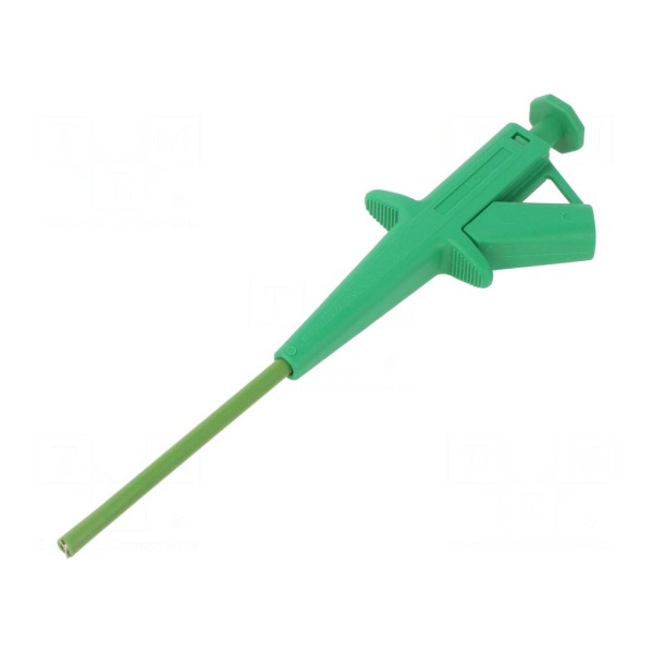 Chwytak pomiarowy typu cęgowego charakteryzuje się prądem znamionowym wynoszącym 4A oraz napięciem znamionowym 1kV. Element został wyposażony w gniazdo o rozmiarze 4mm, co umożliwia jego integrację z popularnymi przewodami pomiarowymi. Całkowita długość chwytaka wynosi 155mm, a jego kolor to zielony.
