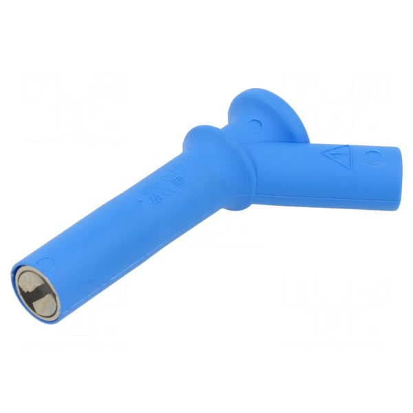 Powierzchnia styku końcówki została wykończona powłoką niklowaną, co wpływa na parametry połączenia. Komponent spełnia wymogi bezpieczeństwa zgodnie z normą EN 61010 dla kategorii CAT IV 1000V. Produkt dostępny jest w kolorze niebieskim.