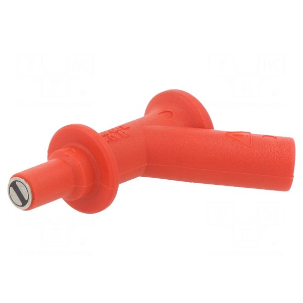 Styk końcówki został poddany procesowi niklowania, co zapewnia trwałość powierzchni przewodzącej. Produkt jest wykonany w kolorze czerwonym. Zgodność z normami CAT IV 1000V oraz EN 61010 potwierdza parametry bezpieczeństwa wymagane podczas wykonywania pomiarów w układach elektrycznych.