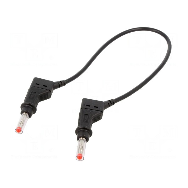 Przewód połączeniowy o długości 0,25 m został wyposażony w izolowane wtyki bananowe 4 mm z obu stron. Złącza posiadają gniazdo osiowe 4 mm oraz suwaną osłonę, co pozwala na bezpieczne użytkowanie w warunkach pomiarowych. Styk został wykończony powłoką niklowaną, co zapewnia odpowiednie połączenie elektryczne.