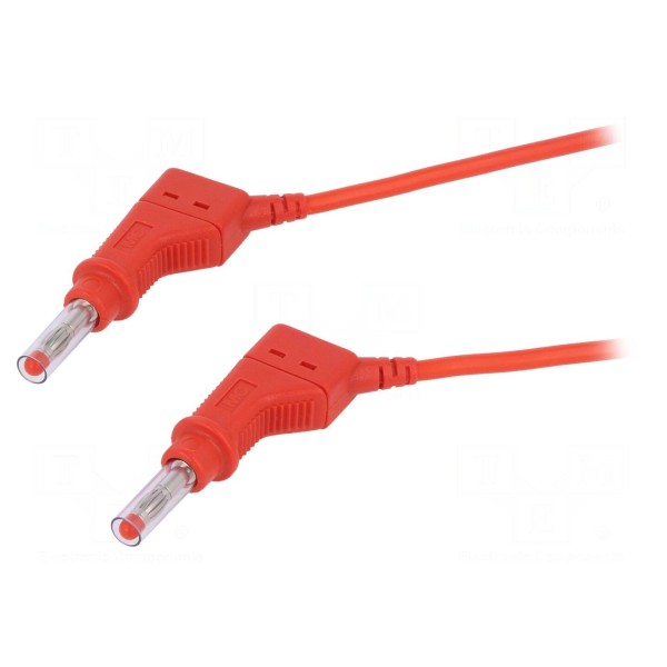 Złącza w wersji izolowanej posiadają gniazdo osiowe 4 mm oraz suwaną osłonę, co podnosi bezpieczeństwo użytkowania. Styki wtyków zostały wykonane z niklowanego materiału, natomiast izolację przewodu stanowi PVC w kolorze czerwonym. Produkt jest zgodny z normą EN 61010 i przystosowany do pracy w kategorii pomiarowej CAT II 600 V.