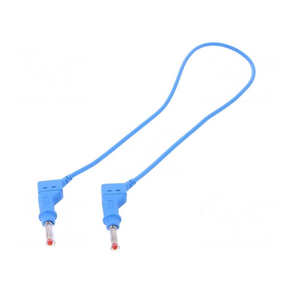 Przewód połączeniowy o długości 0,5 m przystosowany jest do pracy z prądem znamionowym 32 A. Konstrukcja elementu obejmuje niklowane wtyki bananowe o średnicy 4 mm umieszczone po obu stronach przewodu. Złącza posiadają izolację, gniazda osiowe 4 mm oraz funkcjonalną suwaną osłonę.