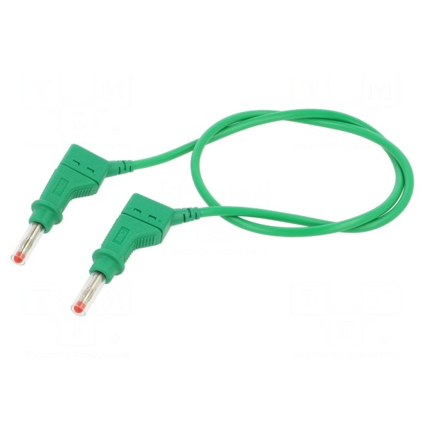 Przewód połączeniowy o długości 0,5 m został zaprojektowany do prac pomiarowych przy prądzie znamionowym 32 A. Wyposażony jest w izolowane wtyki bananowe 4 mm z obu stron, które posiadają gniazda osiowe 4 mm oraz suwane osłony ochronne. Styki złączy zostały poddane niklowaniu, co zapewnia trwałość połączenia.