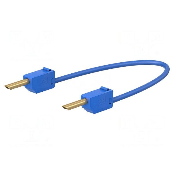 Przewód pomiarowy STÄUBLI o długości 0,3 m charakteryzuje się prądem znamionowym wynoszącym 10 A oraz napięciem znamionowym 30 V AC i 60 V DC. Konstrukcja elementu obejmuje wtyk bananowy 2 mm oraz wtyk bananowy z gniazdem osiowym 2 mm, umieszczone obustronnie. Produkt został wykonany w wersji nieizolowanej z wykorzystaniem pozłacanych styków.