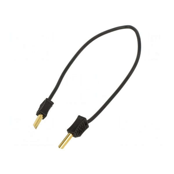 Przewód pomiarowy o długości 0,25 m został zaprojektowany do pracy z napięciem znamionowym 60 V DC oraz 30 V AC i prądem znamionowym 19 A. Z obu stron przewodu znajdują się wtyki bananowe 4 mm, co umożliwia bezpośrednie podłączenie do standardowych gniazd pomiarowych. Konstrukcja złącza jest w wersji nieizolowanej, a powierzchnia styków została poddana procesowi złocenia.