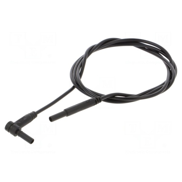 Przewód pomiarowy o długości 1 m został wyposażony w proste oraz kątowe wtyki bananowe o średnicy 2 mm. Złącza posiadają izolowaną konstrukcję oraz złocone pokrycie styków, co zapewnia stabilne połączenie w obwodach pomiarowych. Element ten przystosowany jest do pracy z prądem znamionowym o natężeniu 10 A oraz napięciem znamionowym do 0,6 kV.