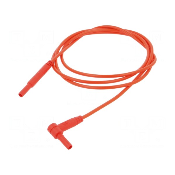 Przewód pomiarowy o długości 1 metra przeznaczony jest do wykonywania połączeń w układach pomiarowych. Element wyposażony jest w proste oraz kątowe wtyki bananowe o średnicy 2 mm, które posiadają izolowane złącza z pozłacaną powierzchnią styków. Przewód wykonano z użyciem izolacji z PVC oraz żyły o przekroju 0,5 mm².