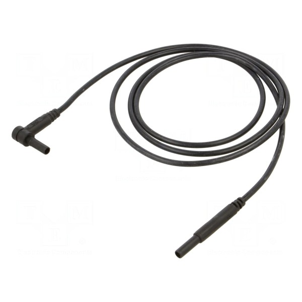 Przewód pomiarowy o długości 1 metra przeznaczony jest do pracy z prądem znamionowym 10A oraz napięciem do 0,6kV. Konstrukcja elementu obejmuje wtyk bananowy 2mm oraz wtyk bananowy kątowy 2mm. Złącza posiadają izolację oraz złocone pokrycie styków, co zapewnia stabilność połączenia w warunkach pomiarowych.