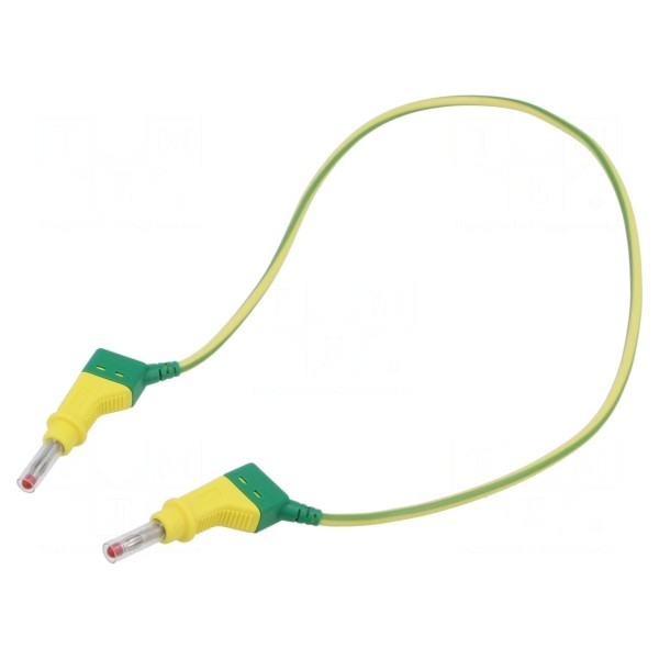 Przewód pomiarowy o długości 0,5 m został wyposażony w wtyki bananowe 4 mm z obu stron. Złącza posiadają gniazda osiowe 4 mm oraz suwane osłony, co zwiększa funkcjonalność podczas pracy z różnymi układami. Elementy stykowe wykonano z mosiądzu, który poddano procesowi niklowania dla zapewnienia trwałości połączenia.