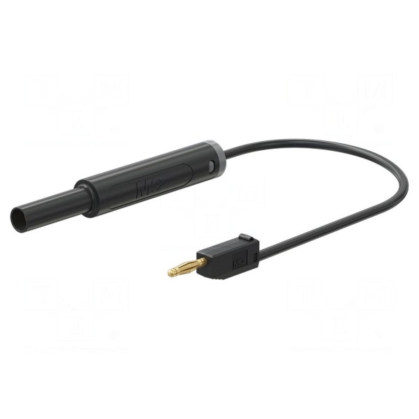 Konstrukcja akcesorium obejmuje gniazdo bananowe 4 mm oraz wtyk bananowy 2 mm, co umożliwia łączenie różnorodnych komponentów pomiarowych. Styki przewodu posiadają powłokę złoconą, która poprawia parametry połączenia. Całość jest zgodna z normą EN 61010, a czarny kolor izolacji ułatwia organizację okablowania w układach pomiarowych.