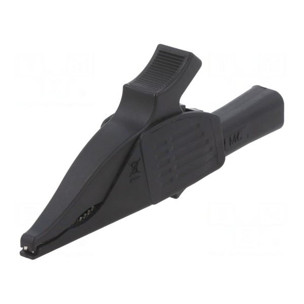 Konstrukcja zacisku została wykonana z niklowanymi stykami, co wpływa na parametry połączenia. Produkt spełnia wymogi normy EN 61010 oraz posiada klasyfikację bezpieczeństwa CAT II 1000V. Element dostępny jest w kolorze czarnym.