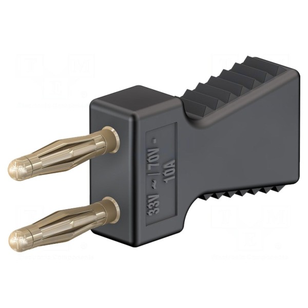 Złącze typu mostek zwierny wykonane w standardzie bananowym 2mm przeznaczone jest do zastosowań laboratoryjnych. Element charakteryzuje się rozstawem wtyków wynoszącym 6mm oraz budową obejmującą gniazdo bananowe 2mm oraz dwa wtyki bananowe 2mm.