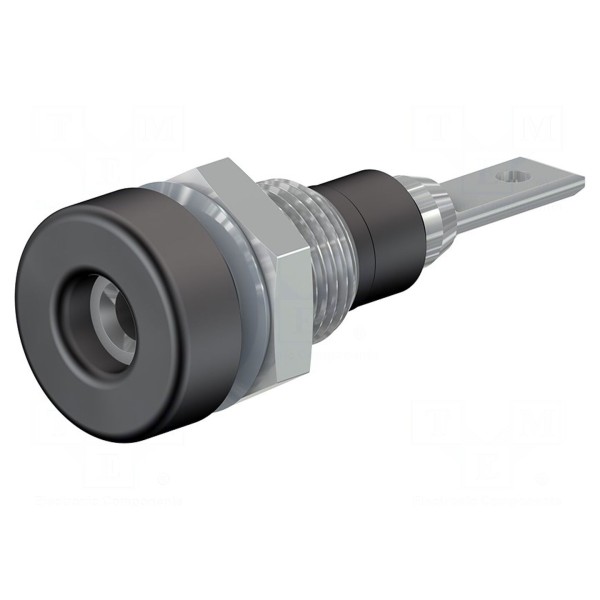 Złącze laboratoryjne typu gniazdo bananowe 2mm w kolorze czarnym przeznaczone jest do montażu na panelu. Element charakteryzuje się prądem znamionowym 10A oraz dopuszczalnym napięciem pracy wynoszącym 30V AC lub 60V DC.