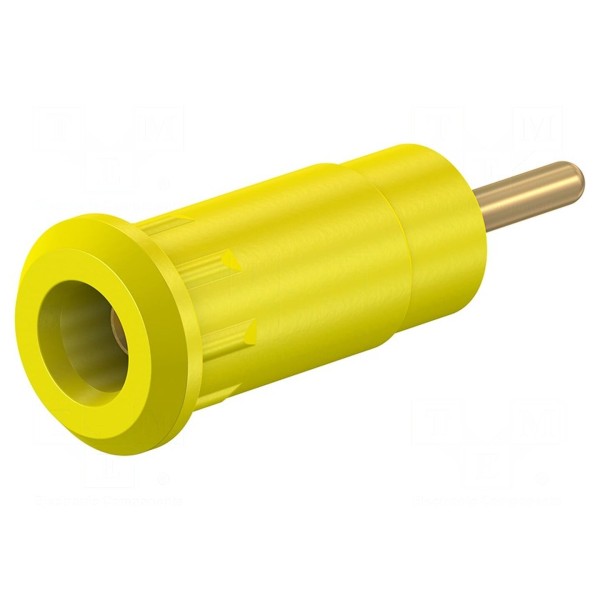 Styk złącza został pokryty warstwą złota, co zapewnia stabilne połączenie elektryczne. Całkowita długość komponentu wynosi 29mm, a jego kolor to żółty. Produkt jest zgodny z normą EN 61010 i spełnia wymagania kategorii bezpieczeństwa CAT III 600V.