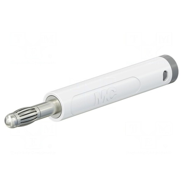 Złącze laboratoryjne typu bananowego o średnicy 4mm występuje w formie nieizolowanego wtyku z dodatkowym gniazdem poprzecznym 4mm. Element przystosowany jest do pracy z prądem znamionowym 32A oraz napięciem znamionowym wynoszącym 30V AC lub 60V DC.