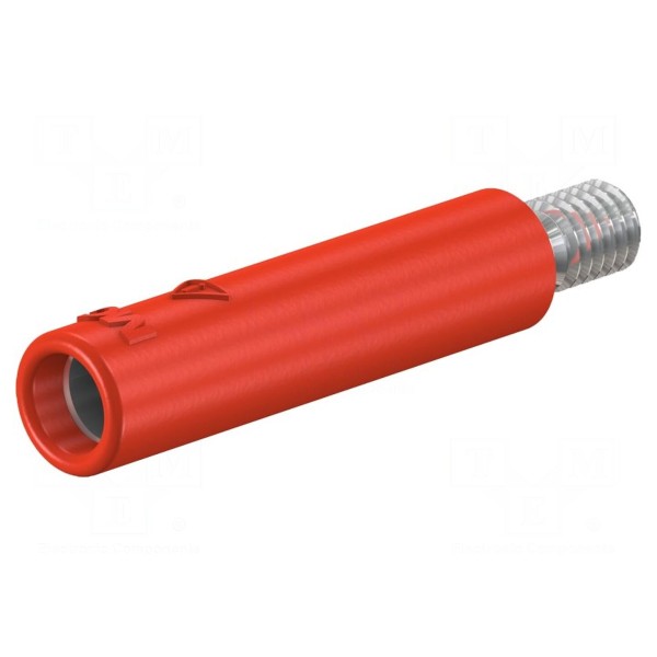 Element posiada izolowaną wersję złącza i jest montowany w sposób przykręcany za pomocą gwintu M4. Całkowita długość złącza wynosi 31,5mm, a jego kolor to czerwony. Komponent jest zgodny z normą EN 61010 oraz spełnia wymogi bezpieczeństwa CAT II 600V.
