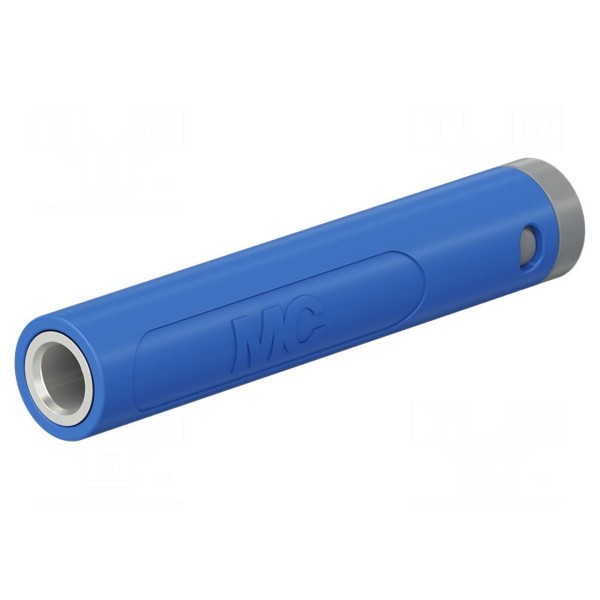 Konstrukcja elementu obejmuje niklowane pokrycie styku oraz dodatkowe gniazdo poprzeczne 4mm. Produkt utrzymany jest w kolorze niebieskim.