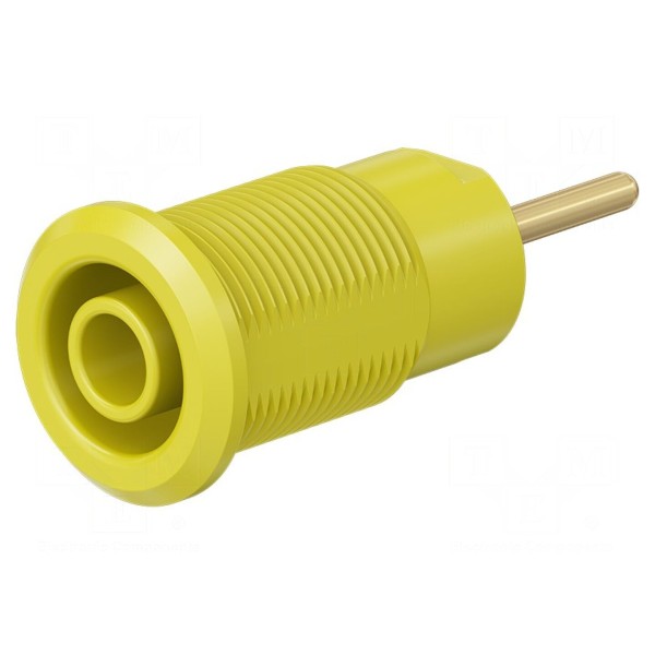 Złącze typu gniazdo bananowe 4mm przeznaczone jest do montażu na panelu. Element charakteryzuje się napięciem znamionowym 1kV oraz prądem znamionowym 24A. Powierzchnia styku została pokryta warstwą złota, co zapewnia odpowiednie połączenie elektryczne.