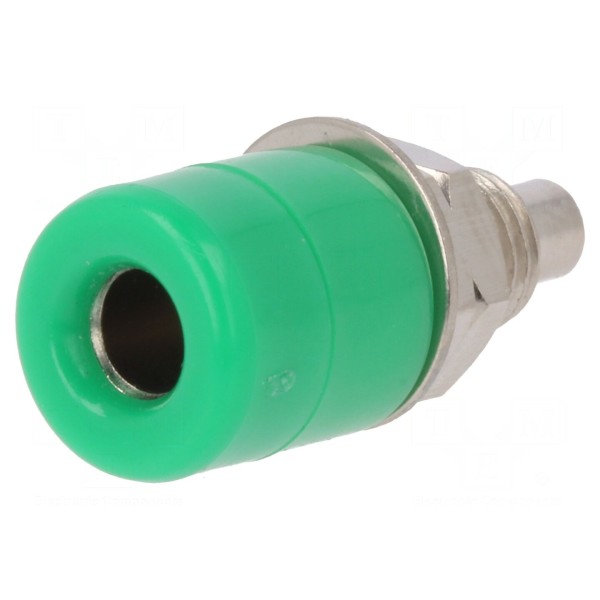 Złącze bananowe 4mm w formie izolowanego gniazda przystosowane jest do pracy przy prądzie znamionowym do 20A. Element został wykonany z mosiądzu z niklowaną powłoką styków, co zapewnia maksymalną rezystancję styku na poziomie 5mΩ. Obudowę złącza stanowi poliamid w kolorze zielonym.