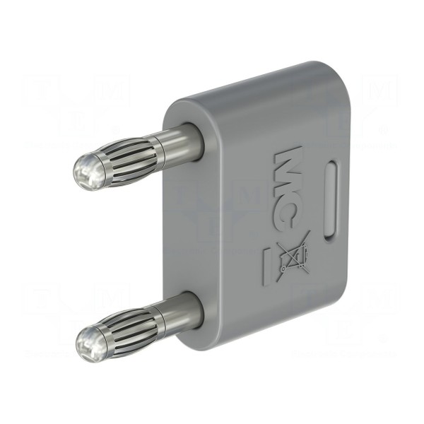 Konstrukcja elementu obejmuje dwa gniazda bananowe 4 mm oraz dwa wtyki bananowe 4 mm. Złącze posiada izolowaną obudowę w kolorze szarym, a styki zostały wykończone poprzez niklowanie w celu zapewnienia odpowiednich parametrów połączeniowych.