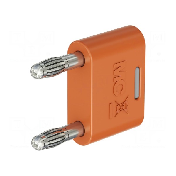 Element posiada niklowane pokrycie styków oraz izolowaną wersję obudowy w kolorze pomarańczowym. Budowa złącza obejmuje dwa wtyki bananowe o średnicy 4mm.