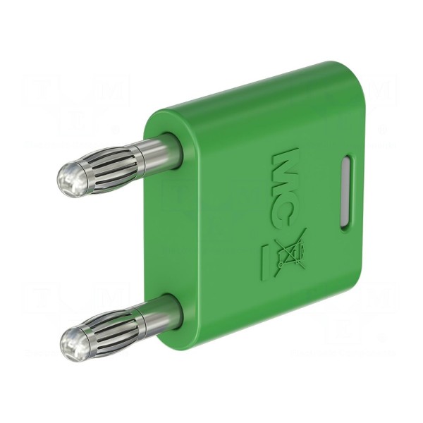 Konstrukcja elementu obejmuje dwa gniazda bananowe 4 mm oraz dwa wtyki bananowe 4 mm. Złącze posiada niklowane pokrycie styków oraz izolowaną wersję obudowy, co wpływa na jego parametry użytkowe. Produkt dostępny jest w kolorze zielonym.