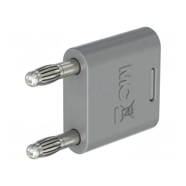 Konstrukcja złącza obejmuje dwa gniazda oraz dwa wtyki typu banan 4mm. Element posiada niklowane pokrycie styków oraz izolowaną wersję wykonania, co wpływa na jego parametry użytkowe. Obudowa złącza została wykończona w kolorze szarym.